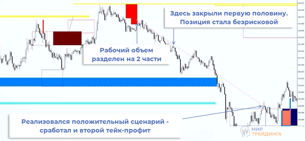 есть реакция на сигнал и срабатывает первый ТР, до второго тейка не доходим, остаток закрывается по стопу. Нейтральный сценарий, результат околонулевой, так как SL по второй части объема компенсируется сработавшим тейк-профитом по первой половине;