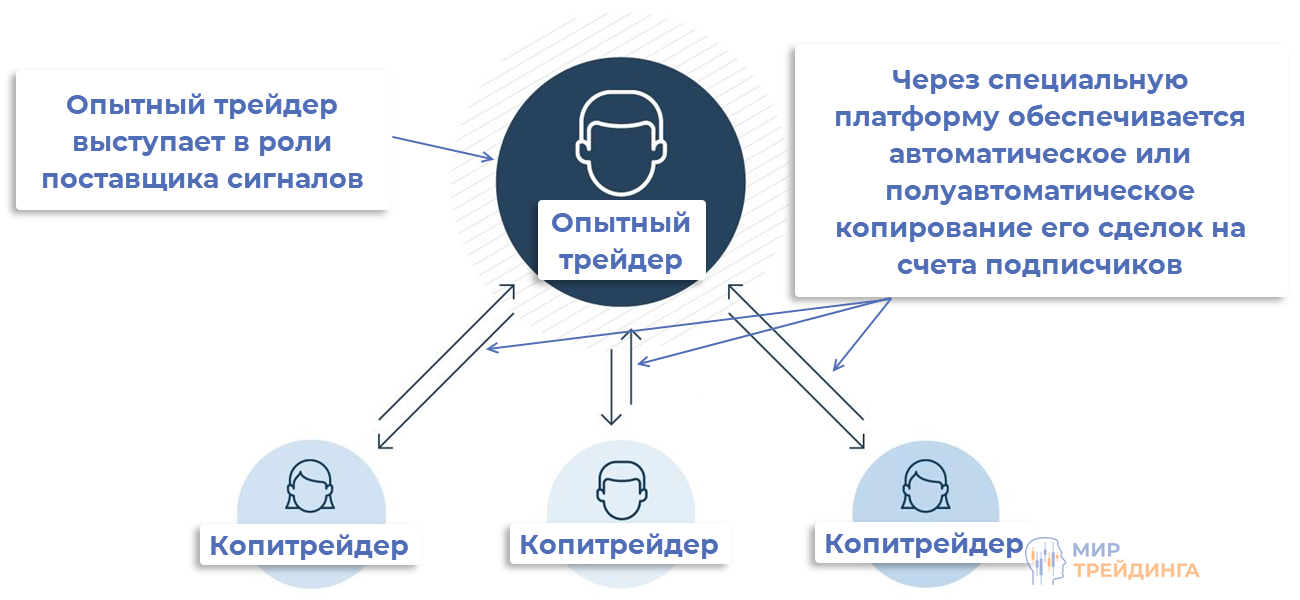 Копитрейдинг означает копирование сделок других трейдеров в автоматическим либо полуавтоматическом режиме. Некоторые рассматривают это как один из вариантов обучения трейдингу. Упрощенно схема выглядит так:
