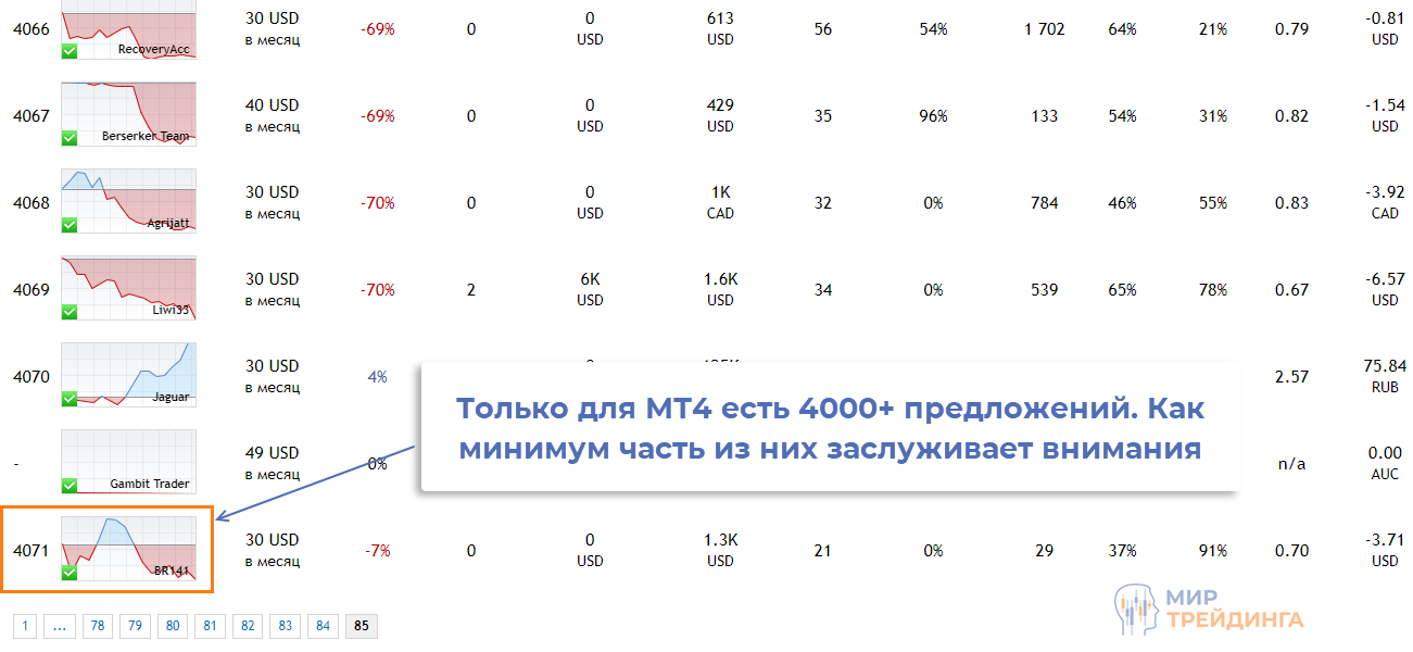 Самый известный сервис копирования сделок трейдеров создали разработчики МетаТрейдера. На mql5.com в разделе «Сигналы» доступны все предложения копитрейдинга. О масштабах этого направления можно судить по количеству провайдеров сигналов. На момент подготовки этого материала для МТ4 было доступно 4000+ предложений. Для МТ5 есть еще 1300+ поставщиков сигналов.