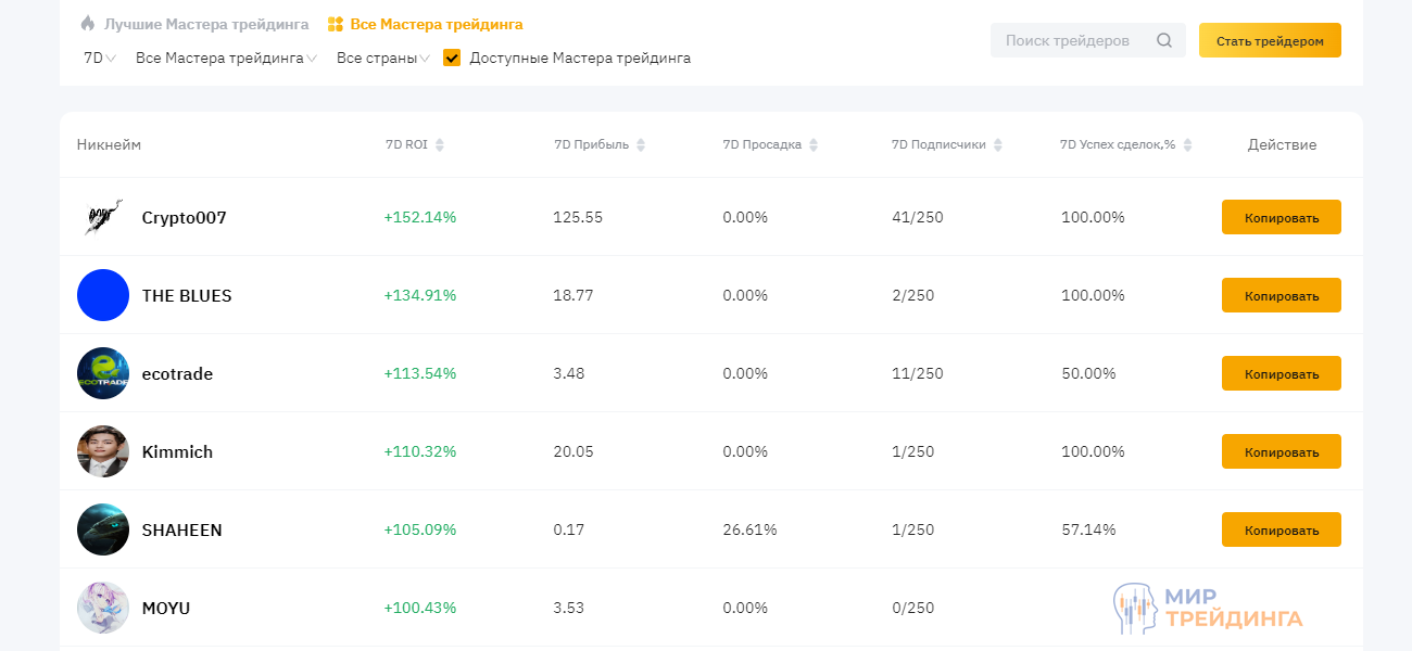 Схожий сервис есть на некоторых криптовалютных биржах. Копитрейдинг реализован, например, на Bybit. Принцип тот же – сделки с мастер-счета переносятся на другие счета клиентов криптовалютной биржи.