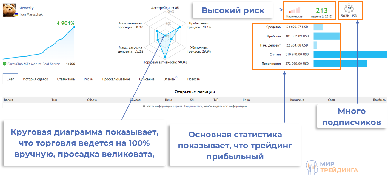 С точки зрения информативности лидирует mql5.com, в аналогичных сервисах выдается меньше данных. Проведем быстрый анализ мастер-счета на конкретном примере: