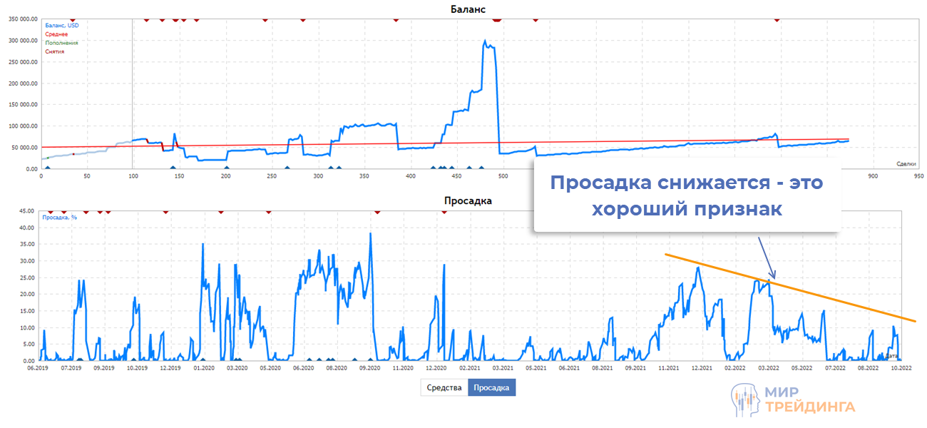 - анализ графика просадки показывает, что со временем стабильность торговли повышается. Просадка постоянно снижается на протяжении последних 8-9 месяцев. Провайдер сигналов стал работать более консервативно;