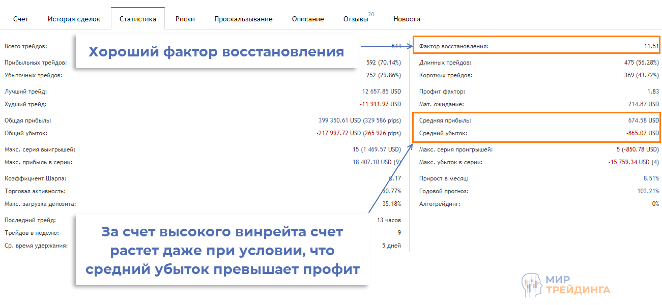- во вкладке «Статистика» есть основные данные по мастер-счету. Отметим высокий фактор восстановления, это еще один аргумент в пользу этого поставщика сигналов. Интересно то, что средний убыток превышает средний профит по сделке. Советник зарабатывает за счет высокого винрейта, при доле прибыльных сделок в 70,1% можно получать профит и с таким соотношением стоп/тейк;