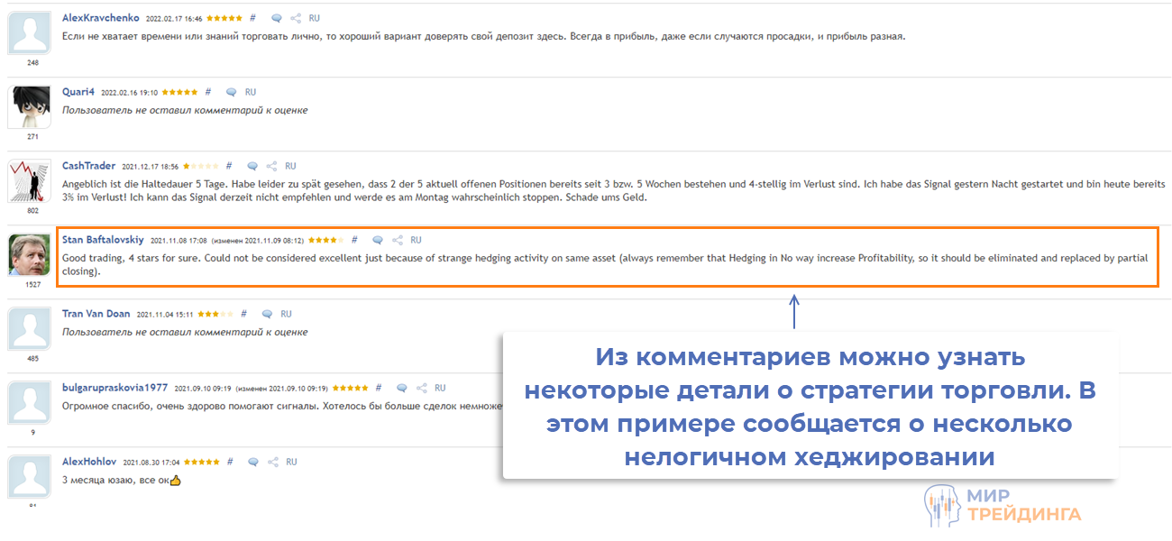 - в отзывах подписчиков можно найти полезную информацию. Например, один из трейдеров сообщил, что на мастер-счете используется не совсем логичное хеджирование, другие сообщают о низкой частоте торговли и прочие нюансы.