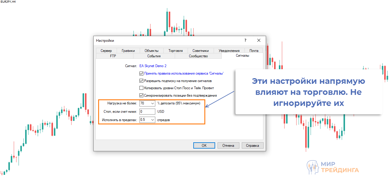 - нагрузку на депозит, если она будет превышена, то сделки не будут копироваться;
