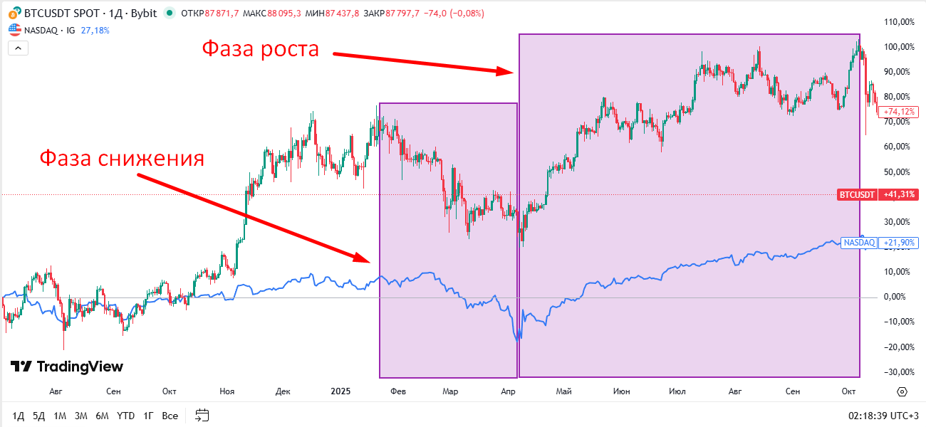 Корреляции являются динамичным инструментом. Связи между активами могут меняться под влиянием монетарной политики, геополитики или настроений инвесторов. Сильная корреляция в прошлом может ослабнуть или исчезнуть в новом рыночном цикле. Так было не раз с корреляцией биткоина и американского индекса Nasdaq. Слепое следование историческим зависимостям опасно. Важно учитывать не только цифры, но и контекст макроэкономического цикла, фазу рынка и направление капитала.