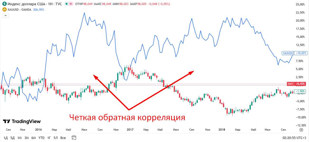 Корреляция между индексом доллара и золотом