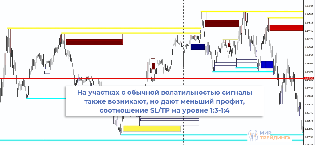 Для наглядности можете сравнить этот участок графика с относительно спокойным периодом. Волатильность ниже и ровно такие же точки входа обеспечивают соотношение SL/TP на уровне 1:3…1:4. Это тоже неплохой показатель, но все же в 2-3 раза меньше по сравнению с высоковолатильными отрезками графика.