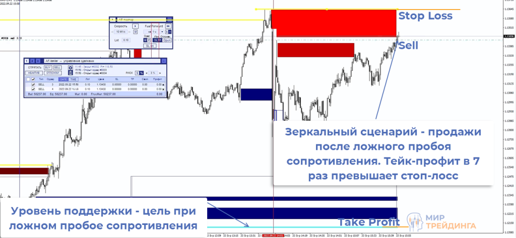 После отработки первого сценария индикатор стратегии Снайпер дал зеркальную точку входа. Ложно пробивалось сопротивление, затем был откат и возможность для продаж. Можно было продавать со стопом в 20 пунктов и тейк-профитом в районе 140 пунктов.