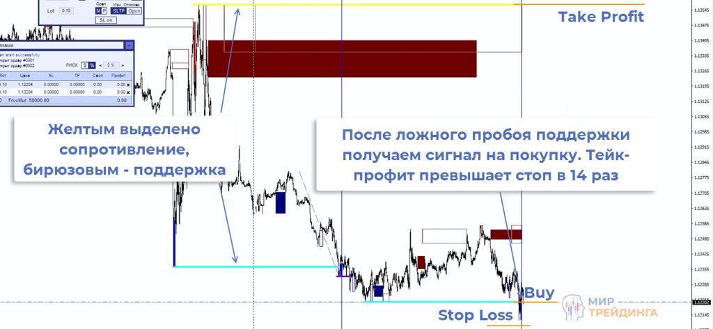 Цель обычно выставляется в районе противоположного уровня. Из-за роста волатильности в кризисные периоды сильно улучшается отношение тейка к стопу. Нередко формируются точки входа с профитом, превышающим стоп в 10…20 раз.