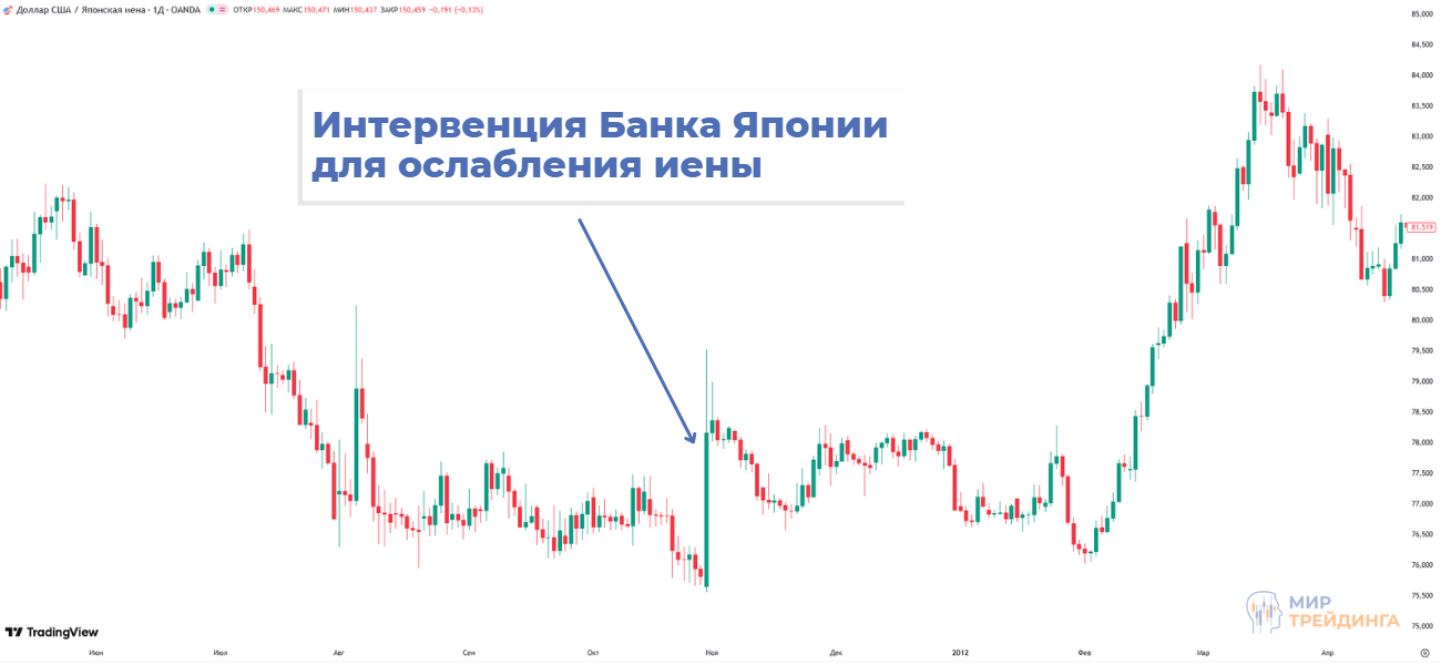 Центральный Банк Японии долгое время использовал вербальные интервенции – предупреждал участников о том, что готов вмешаться. После нескольких интервенций с ограниченным эффектом ЦБ радикально изменил денежно-кредитную политику и курс иены стал падать против основных валют в долгосрочной перспективе.