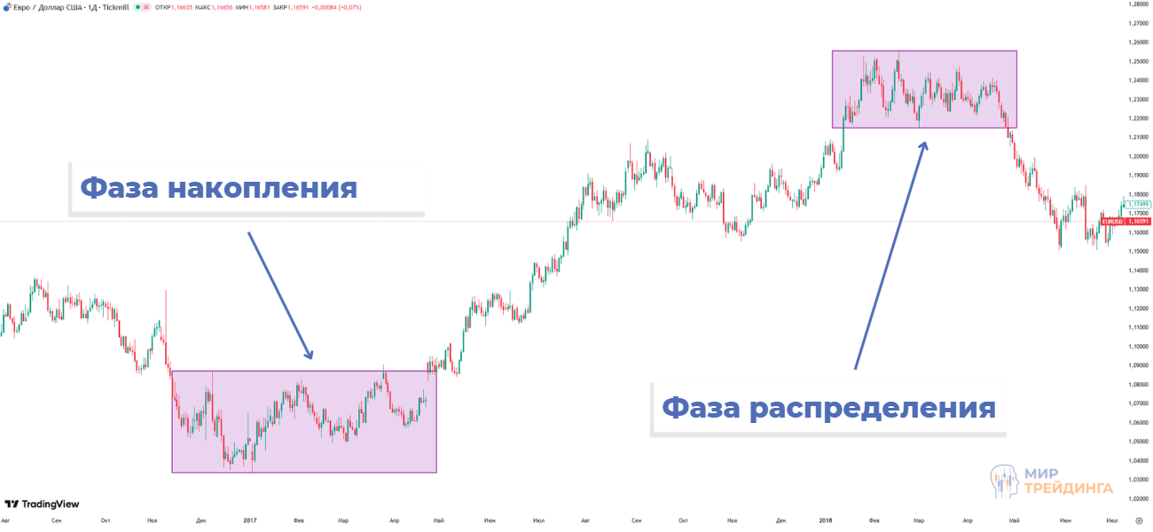 1. Этап накопления (accumulation) – набор позиций в узком диапазоне.