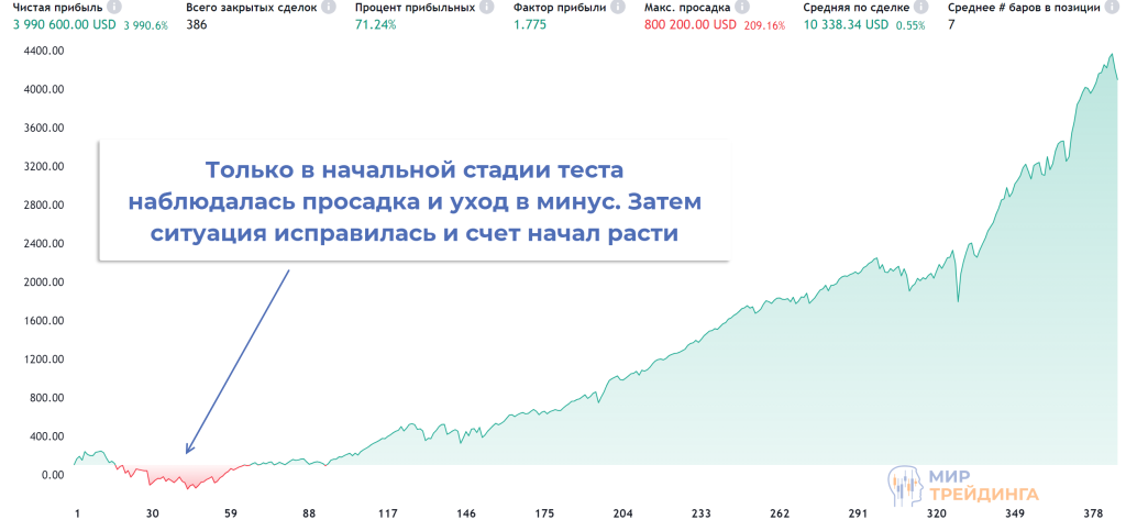 В статистике выделяется количество сделок и винрейт. Стратегия позволила заключить 386 сделок, для дневного таймфрейма – это неплохой результат. Винрейт составил 71,24%, это также хороший результат, 71 сделка из 100 закрывалась с прибылью.