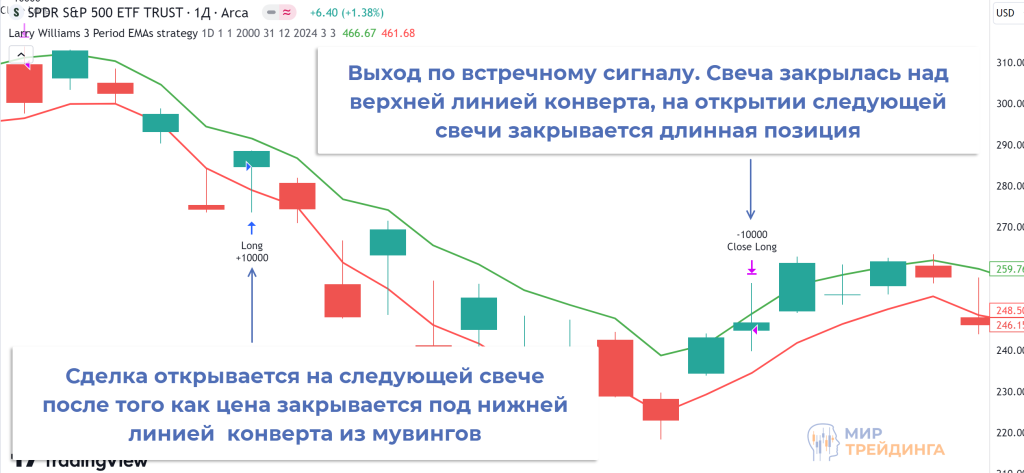 Анализ отдельных сделок показывает, что стопы не используются. Вместо этого позиции закрываются по встречному сигналу. В примере ниже лонг открыт на следующей свече после того как предыдущая свеча закрылась под нижней границей конверта.