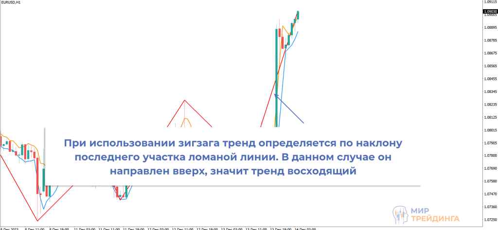 стандартный или модифицированный зигзаг. Направление тренда определяется по направлению последней волны индикатора.