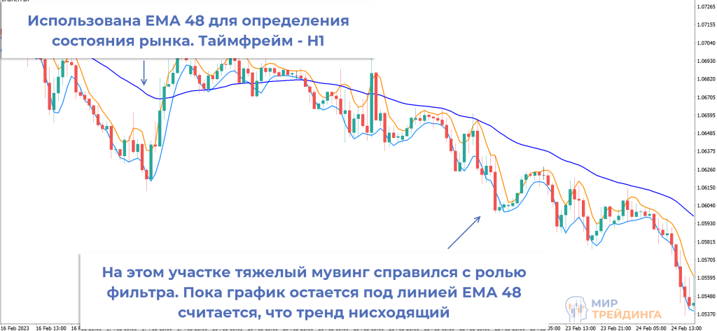 можно применять тяжелую МА, построенную по ценам закрытия, период подбирается индивидуально. Если работаете на дневном графике, то можно попробовать период 20, на М15 период может быть больше. Состояние рынка определяется по положению графика относительно линии тяжелой скользящей средней. Пока свечи остаются над линией работаем только в Buy и наоборот;