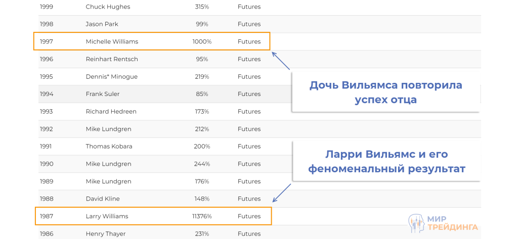 Важен не сам факт победы, а то, что Уильямс показал результат +11376% за год. Стартовый капитал участников на срочном рынке составлял $10000, это значит, что к концу года баланс превысил $1 млн. Для этого турнира такой результат – абсолютный рекорд.