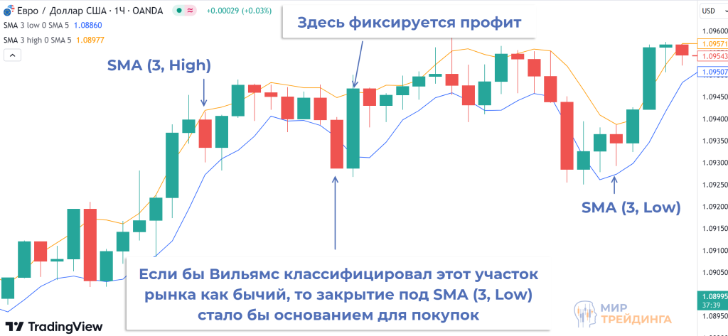 работа ведется в направлении тренда. Если рынок растет, то будут открываться только сделки на покупку, основание для входа в рынок – закрытие свечи под линией, построенной по Low. На медвежьем рынке Уильямс работает только в Sell, для продаж нужно закрытие свечи над мувингом, построенным по High;