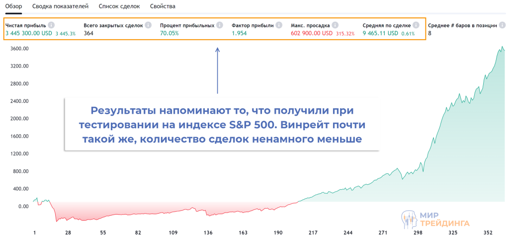 Схожий результат получаем по индексу NASDAQ. Здесь также использовался дневной временной интервал, винрейт чуть больше 70%, стратегия обеспечила 364 точки входа. Результаты очень близки к тому, что дало тестирование на S&P 500.