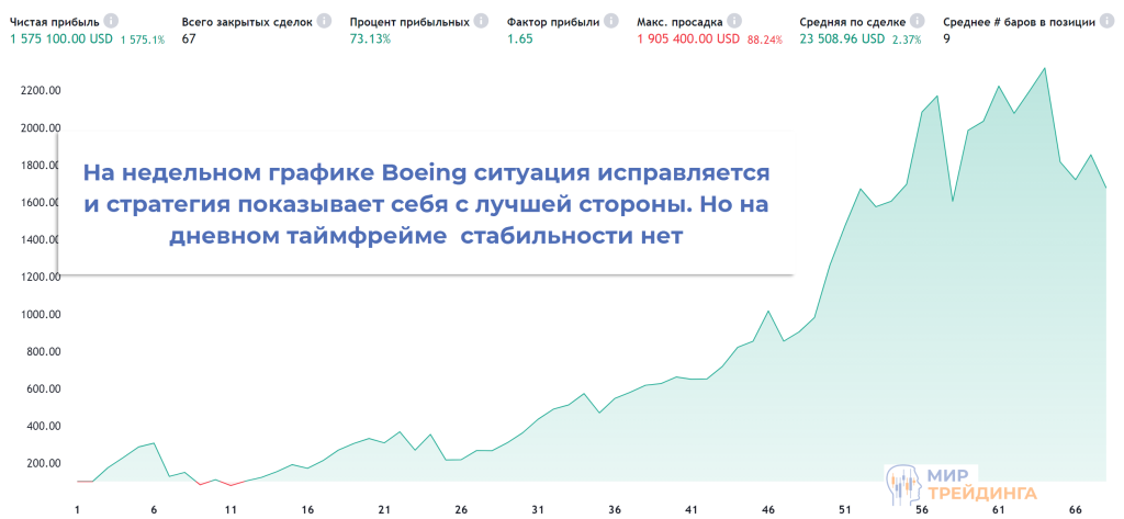 На акциях отдельных компаний ситуация уже не настолько однозначная. Например, на дневном графике Boeing нет стабильности, но при переходе на недельный таймфрейм статистика выглядит приемлемой.
