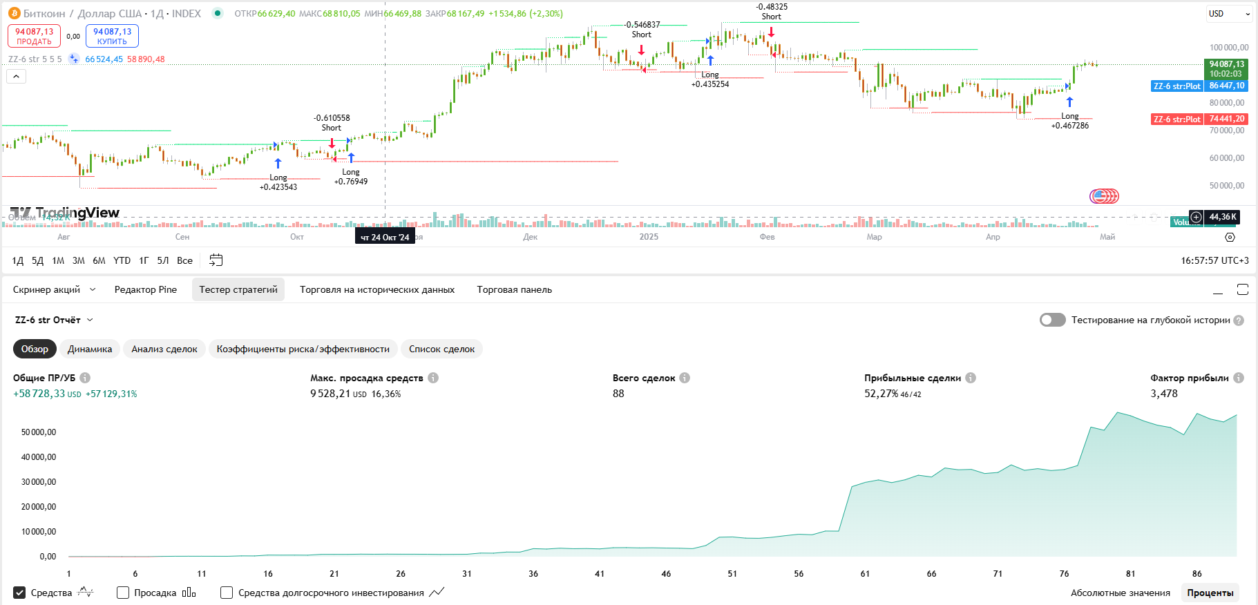 Если вы ищете реально работающую стратегию для торговли Биткоином, которую можно настроить и протестировать за 5 минут — попробуйте Noro ZZ-6 Strategy на платформе TradingView. Она показывает хорошие результаты при грамотном управлении рисками и хорошо адаптируется под дневной график.