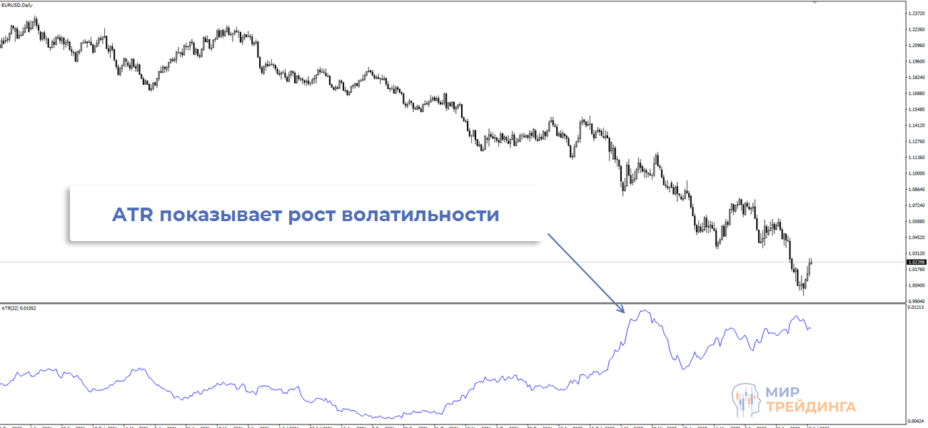 На примере EURUSD видно, что средняя дневная волатильность увеличивается. ATR начинает расти. Это значит, что за день цена проходит все большее расстояние.