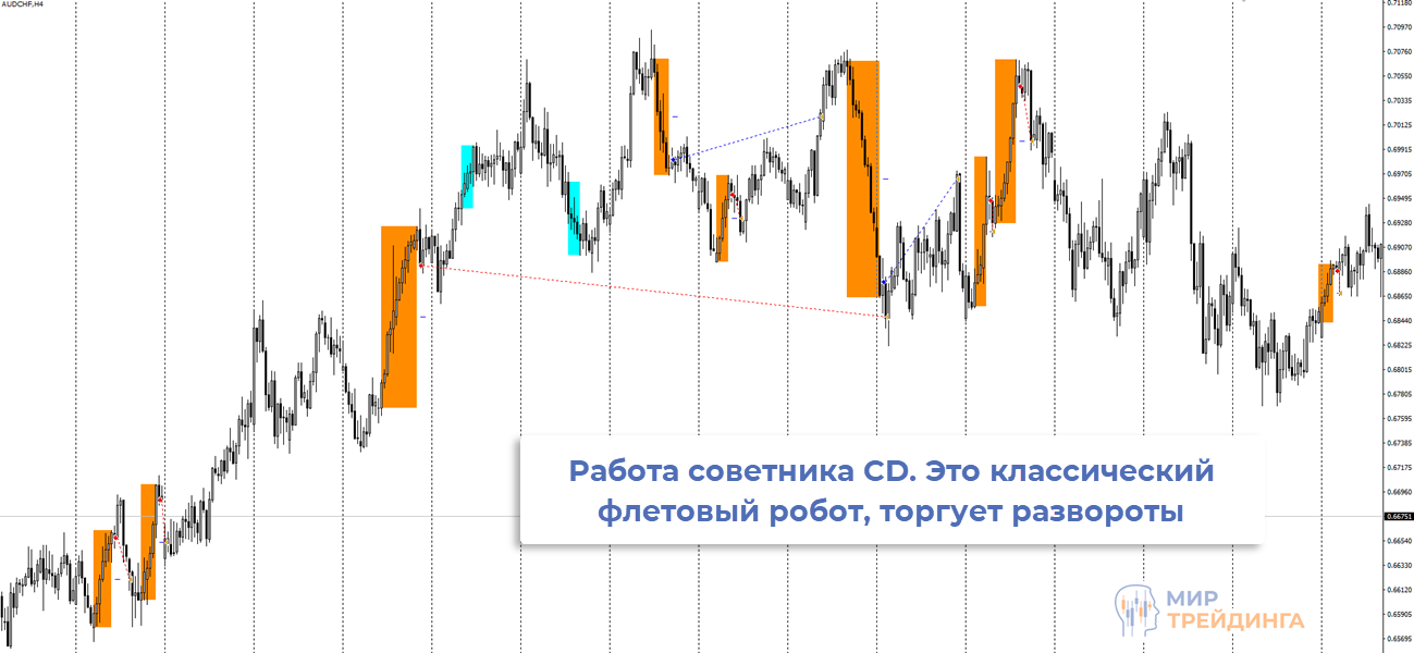 Пример такого типа роботов – наша авторская разработка под названием CD. Он накапливает максимально профит во флете, а в период волатильности выходит по безубытку либо получает стоп-лоссы.