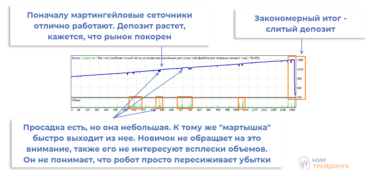 Поначалу роботы этого типа приносят прибыль. Поэтому их и используют новички, но конец всегда один – «кочерга» на кривой роста депозита и слив счета. Все советники с мартингейлом заканчивают так.