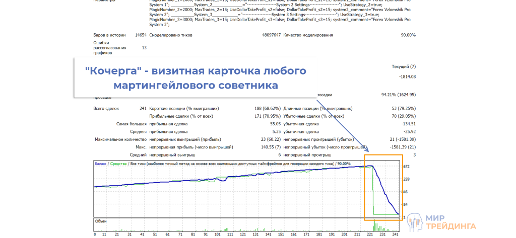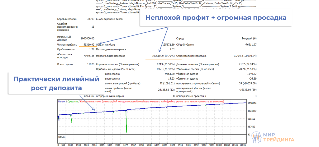 В этом примере некорректно говорить, что весь результат получен за счет торговли с минимальным объемом. При мартингейлелот растет, причем довольно быстро, так что в реальности использовались куда большие объемы. Минимальными были только первые сделки перед усреднением.