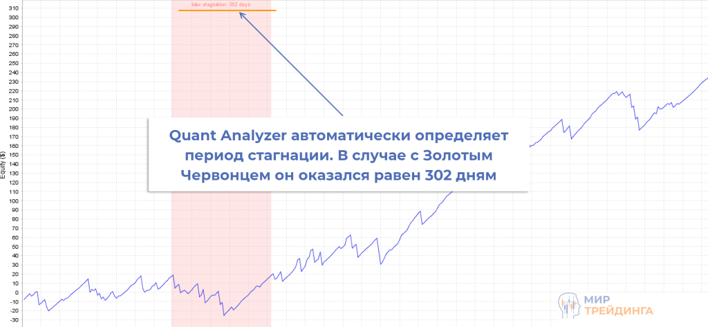 период стагнации удобно оценивать через QuantAnalyzer. Для Золотого Червонца он оказался равен 302 дням. То есть за период 5-летнего теста был отрезок, продолжительностью в 302 дня, на котором советник практически не зарабатывал.