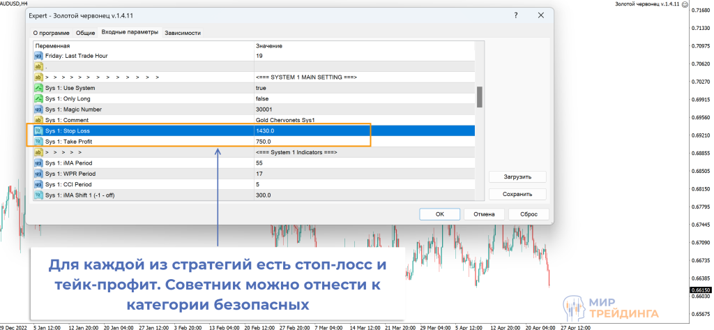 В состав этого робота включено 2 стратегии с отдельными блоками настроек для каждой из систем. Червонец можно отнести к категории безопасных – для обеих торговых стратегий предусмотрены стоп-лоссы и тейк-профиты.