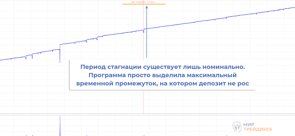 стагнации практически нет. Формально QuantAnalyzer выделил участок в 18 дней, на котором депозит не рос. Но это объясняется тем, что программа оценивает статистику исключительно с точки зрения математики.