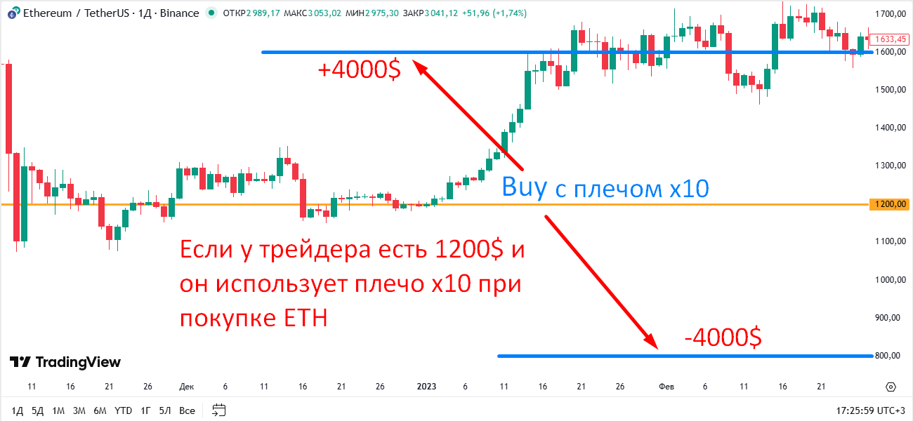 Трейдер имеет 200$ и использует плечо x5. В результате он получает возможность управлять позицией объемом 1 000$. Если актив растет на 2%, прибыль составит 20$, то есть +10% к депозиту. Но если цена пойдет в противоположном направлении, убыток будет таким же. Кредитное плечо не создает риск само по себе, но многократно усиливает как прибыль, так и потери. Более подробно о выборе торгового плеча мы рассказали в этой статье.