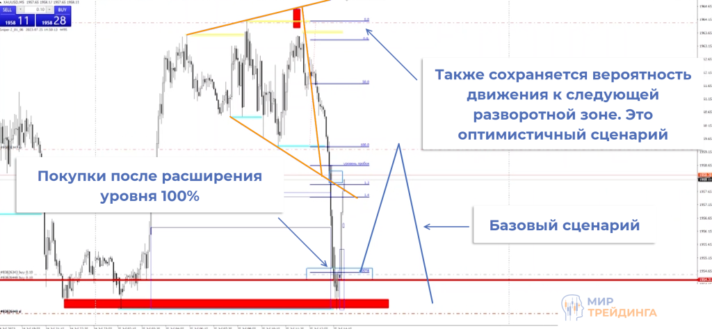 первая позиция открывалась после ложного пробоя (расширения). Первая цель располагалась в зоне ближайшей пробитой поддержки. Помимо базового сценария рассматривался и оптимистический – поход к недавним разворотным зонам в области максимумов;