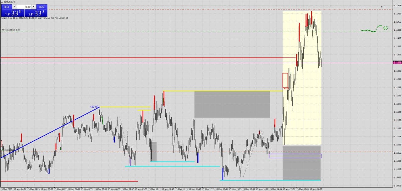 Сегодня, 15 мая, с 15:30 до 16:00 мск ожидается рост волатильности — возможен выход новостей из США, способных повлиять на движение пары EUR/USD. В такие моменты важно строго соблюдать правила торговой системы, в частности: