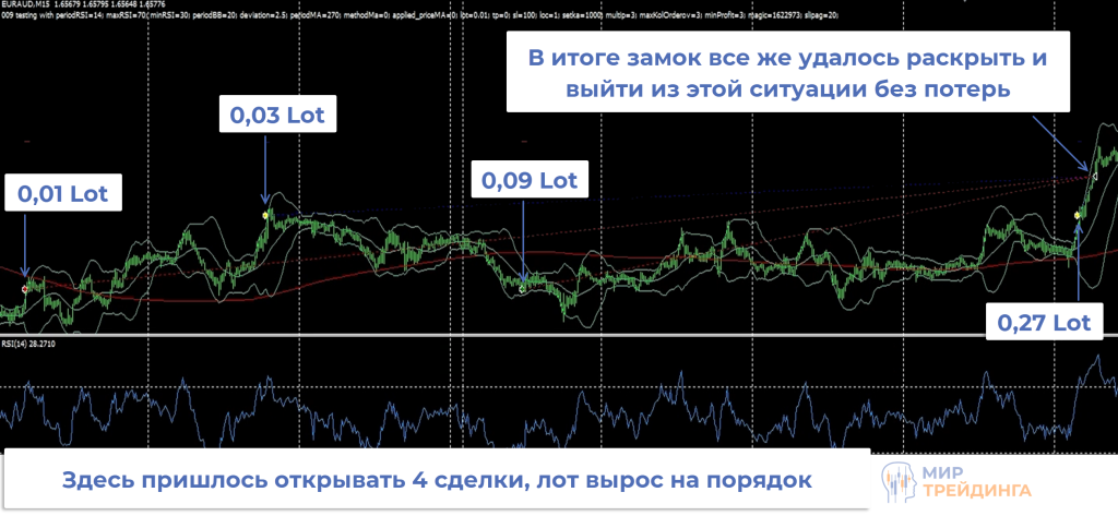 Максимально опасные сценарии формируются во время флетов. Представьте, что после входа в замок график развернулся и пошел в обратном направлении. Если он пройдет пороговое расстояние, то советник откроет еще одну локирующую позицию и снова увеличит лот в 3 раза.