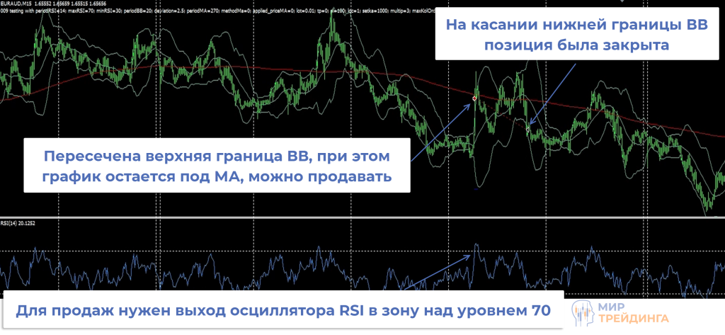 В примере ниже открыта короткая позиция. В момент пробоя верхней границы ВВ график оставался под МА, поэтому советник не забраковал сигнал в Sell. Линия RSI оставалась в зоне над уровнем 70, все условия выполнены – открыта сделка.