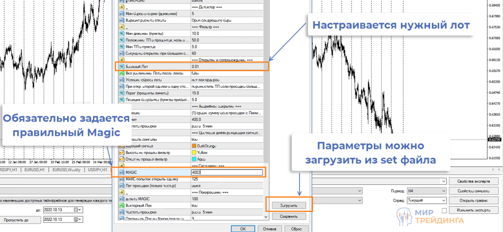Особое внимание обратите на Magic. Этим номером советник отмечает свои ордера, чтобы не путать их с другими. Рекомендую использовать 4-значный номер, первая цифра соответствует советнику в целом, 2 последние – разным валютным парам. Например, для EURUSD Magic равен 4001, для GBPCHF – 4002, последний Magic будет равен 4021.