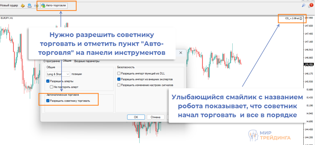остается разрешить автоторговлю в настройках самого робота и на панели инструментов терминала. Если все сделано верно, то в правом верхнем углу появится улыбающийся смайлик с названием.