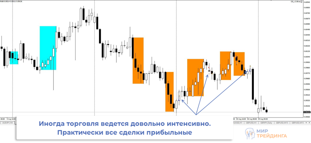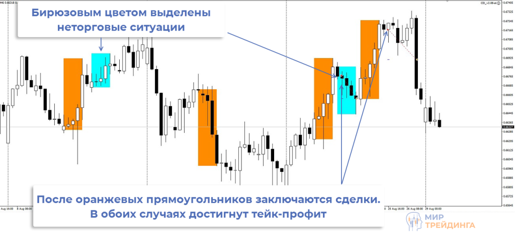 CD учитывает количество свечей в этом безоткатном движении. После добавления на график он выделяет подходящие сетапы цветными прямоугольниками. Оранжевые соответствуют ситуациям, в которых ведется работа, бирюзовые – ситуациям, когда ордер не выставляется.