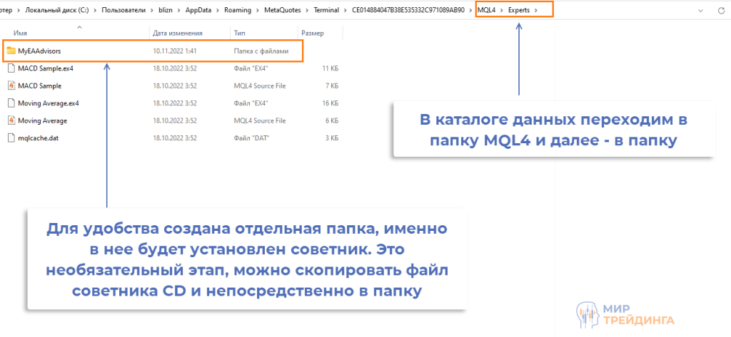 в каталоге данных перейдите по пути «MQL4» -> «Experts». Здесь можно создать отдельную папку и помещать пользовательские советники в нее. Это необязательный этап. Остается лишь вставить файл самого CD непосредственно в папку Experts или в созданную в ней другую папку;