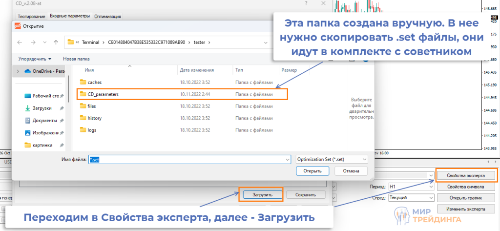 откроется папка tester. Для удобства в ней лучше создать свою папку, вставить в нее файлы настроек и двойным нажатием на нужный set файл загрузить параметры. Для каждой пары и каждого таймфрейма есть свои параметры. Ориентируйтесь по таблице из сопроводительной документации.