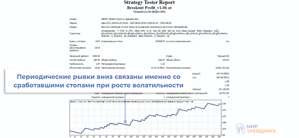 Ключевой недостаток – фиксированный размер SL. При росте волатильности стоп часто срабатывает, в итоге движение продолжается в нужном направлении, но уже без нас. Крупный тейк-профит позволяет быстро компенсировать накопленные убытки, это видно по кривой роста депозита.
