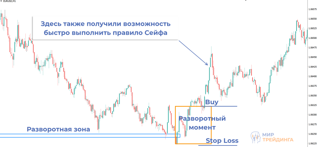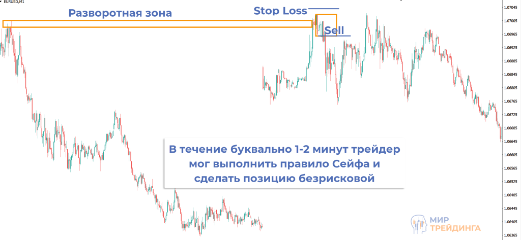 Сигнал на продажу отработал быстро. Уже в течение 1-2 минут после входа в рынок можно было выполнять правило Сейфа. С этого момента риск по сделке равен нулю. В этом примере график в итоге дошел бы до тейк-профита.