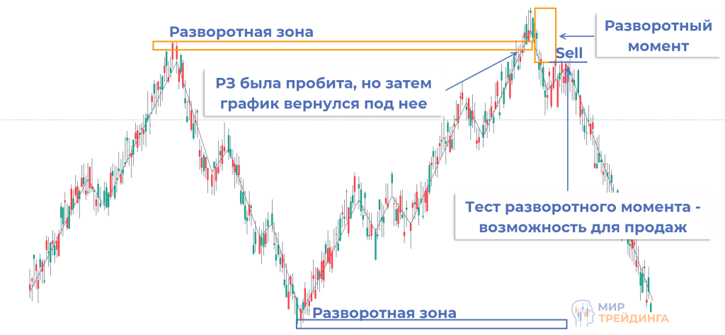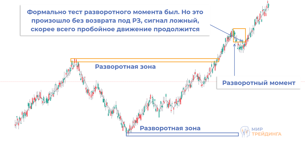 Возможны ситуации, при которых РЗ пробивается, но РМ формируется без возврата в разворотный уровень. Такие точки входа игнорируются, чаще всего они не отрабатывают и продолжается движение в направлении пробоя.