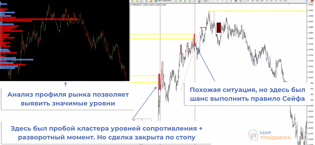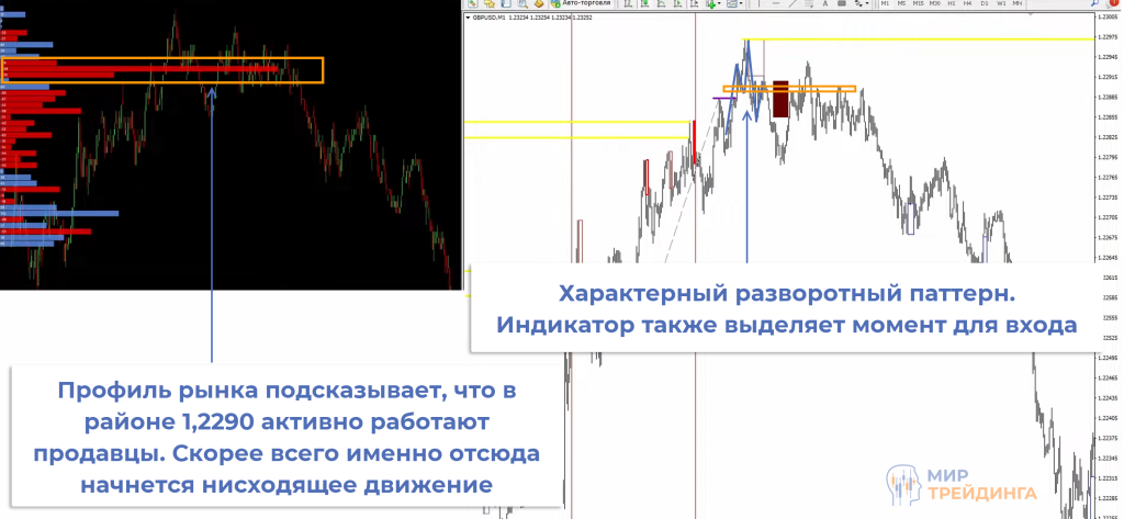 Анализ профиля рынка дополняет индикатор Снайпер. С помощью горизонтальных объемов мы смогли определить ключевой уровень, в районе которого особо активно работают продавцы. В нашем примере это 1,2290, на гистограмме виден явный пик.
