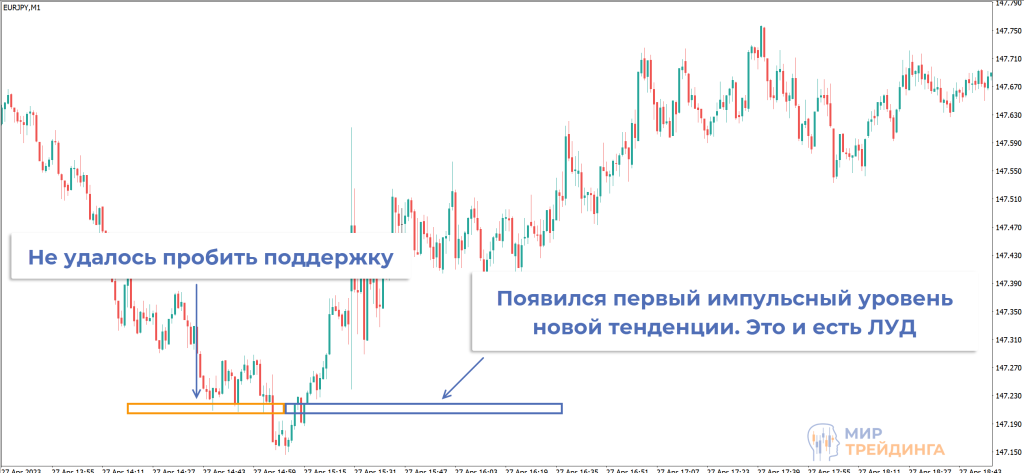ЛУД можно рассматривать как доказательство смены тенденции. По ходу тенденции выстраивается серия импульсных уровней, затем график не может пробить очередной ИУ, так и появляется ЛУД. В примере ниже был уровень поддержки, он пробит, но затем график вернулся в зону над ним и началось восходящее движение. Первый уровень в начале новой тенденции и есть ЛУД;