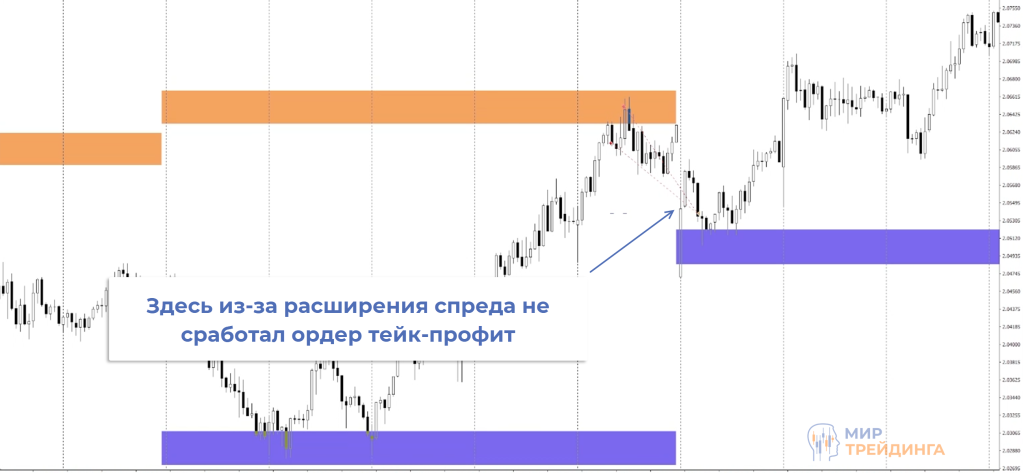 Был интересный момент, когда из-за ГЭПа на открытии недели цена находилась ниже тейк-профита, но ТП не сработал. Это связано с расширением спреда. Хотя визуально кажется, что график уходил ниже уровня тейка Аск в это время находился над ТП, поэтому тейк-профит и не сработал в этот момент.
