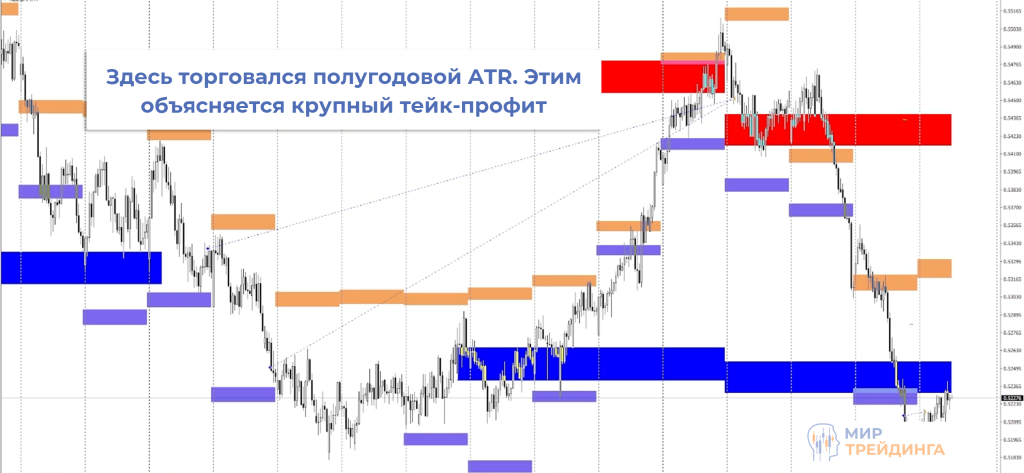 По GBPUSD работалось превышение квартального ATR. Сильное падение и расширение уровней ATR позволило работать в Buy, сценарий отработал, хотя и не сразу. Профит здесь превысил 1000 пипсов.
