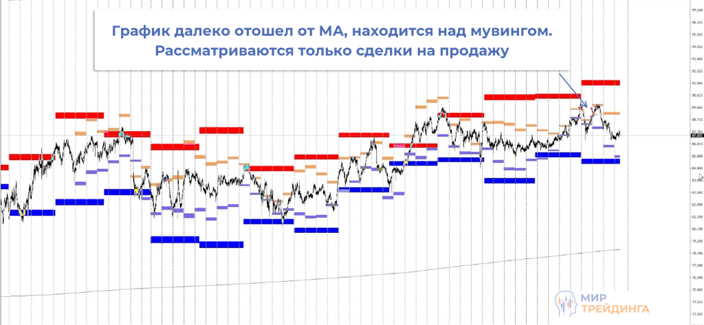 В роли фильтра используется максимальное отклонение графика от линии мувинга. Индикатор выполняет роль магнита, к которому цена обязательно вернется. Если график максимально отклонился от линии МА вверх, то я рассматриваю только сделки на продажу и наоборот. Это одна из причин того, что осечек практически нет.